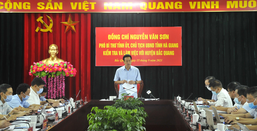 Phát biểu tại buổi làm việc, Chủ tịch UBND tỉnh Nguyễn Văn Sơn nêu rõ: Tình hình dịch Covid-19 diễn biến phức tạp, tác động đến các lĩnh vực; nhất là giá trị sản xuất công nghiệp, thương mại – dịch vụ - du lịch trên địa bàn tỉnh giảm rõ rệt. Do đó, các huyện có thế mạnh về nông nghiệp và nhiều diện tích cam như Bắc Quang, Quang Bình, Vị Xuyên cần phải đẩy mạnh phát triển nông nghiệp để đóng góp tích cực vào tăng trưởng kinh tế của tỉnh; đặc biệt, cần tính toán cụ thể vai trò của Nhà nước, người dân, HTX trong việc tiêu thụ cam. Xác định cụ thể diện tích và xem xét điều kiện sản xuất cây vụ Đông để khai thác tối đa tiềm năng, lợi thế; đẩy mạnh ứng dụng khoa học kỹ thuật vào sản xuất; chú trọng phát triển kinh tế hộ; quan tâm đến khâu chế biến để nâng cao giá trị sản phẩm nông, lâm nghiệp.