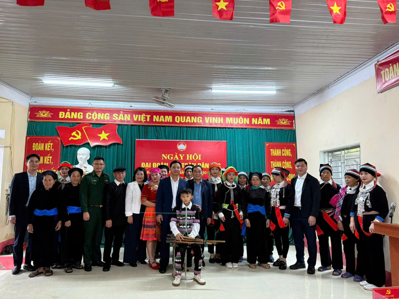 Đồng chí Nguyễn Thành Trung, Tỉnh ủy viên, Phó Trưởng Ban Tổ chức Tỉnh ủy cùng các đồng chí Thường trực Đảng ủy chụp ảnh lưu niệm tại ngày hội đại đoàn kết khu dân cư thôn Nặm Tà.