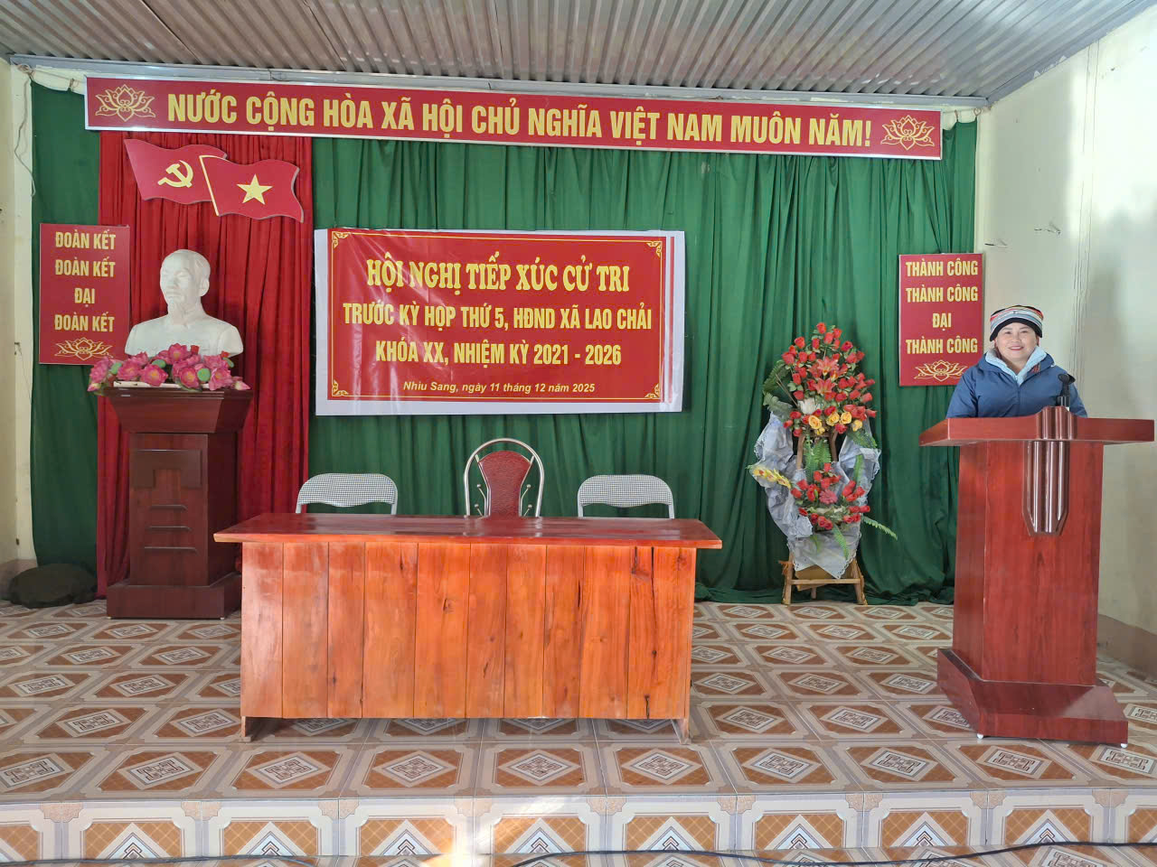 Tại buổi tiếp xúc, đại diện Tổ 2 đại biểu HĐND xã đã thông báo tới cử tri dự kiến nội dung, chương trình Kỳ họp thứ 5 HĐND xã Lao Chải; báo cáo tóm tắt tình hình phát triển kinh tế – xã hội năm 2025, phương hướng nhiệm vụ năm 2026; kết quả giải quyết các ý kiến, kiến nghị của cử tri tại kỳ họp thứ 4 HĐND xã Lao Chải.