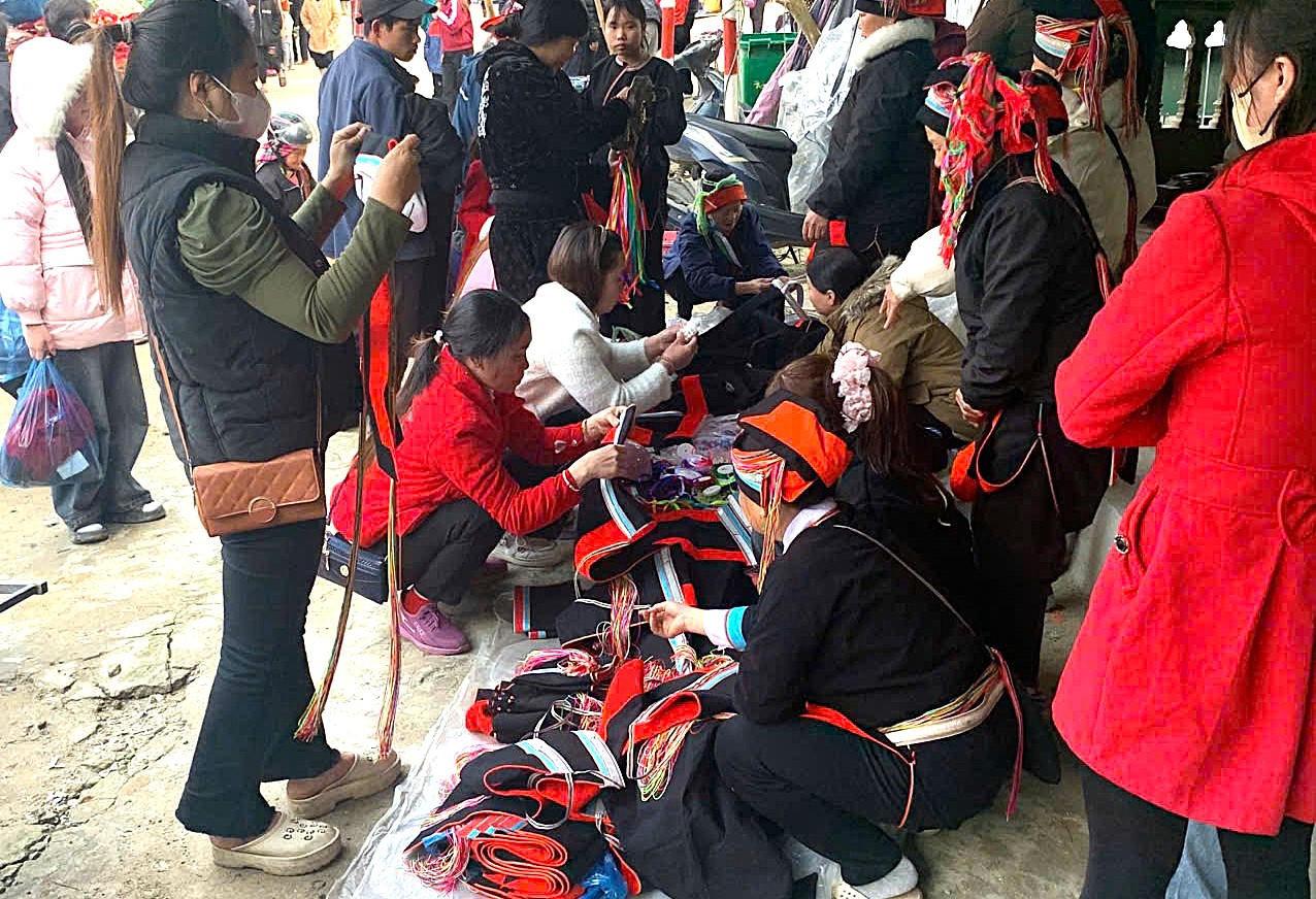 Tại các gian hàng bán trang phục dân tộc Dao, tiếng cười nói rộn ràng không ngớt. Các cô gái trẻ vây quanh những sạp treo đầy váy áo, khăn choàng và những sợi đai lưng thêu tay tỉ mỉ. Người chọn vải, người ướm thử những bộ váy mới với mong muốn có được diện mạo xinh đẹp nhất để diện trong những ngày du xuân, chúc Tết. Đối với đồng bào nơi đây, bộ trang phục mới không chỉ là quần áo, mà còn là niềm tự hào và nét văn hóa được gìn giữ qua nhiều thế hệ.