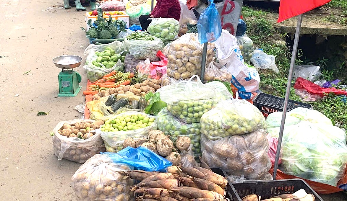 Các mặt hàng nông sản như rau xanh, ngô, thóc, gia cầm, lơn… do bà con tự sản xuất được bày bán, góp phần tăng thu nhập cho các hộ gia đình..